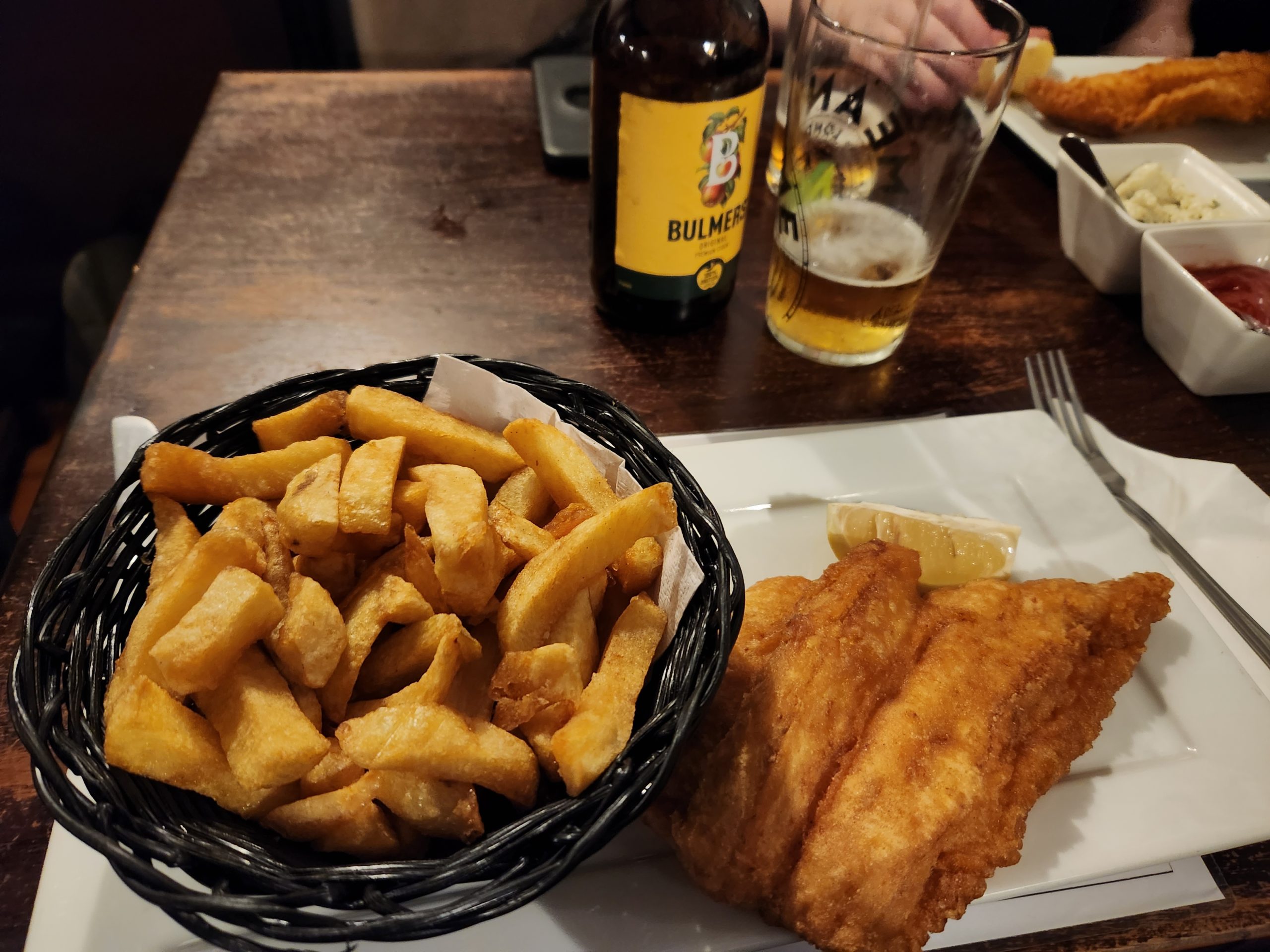 Later, after finishing up with the gym and the washing we went to the nearby pub for some beer. In between beers, we went to a fish and chips restaurant nearby to try some English fish and chips. It was expensive, costing 16 pounds for just one piece of fish with chips – and my fish had lots of bones still in it. It was quite a different experience from the fish and chips that we have in Australia. After the fish and chips, we went back to the pub for a few more beers.