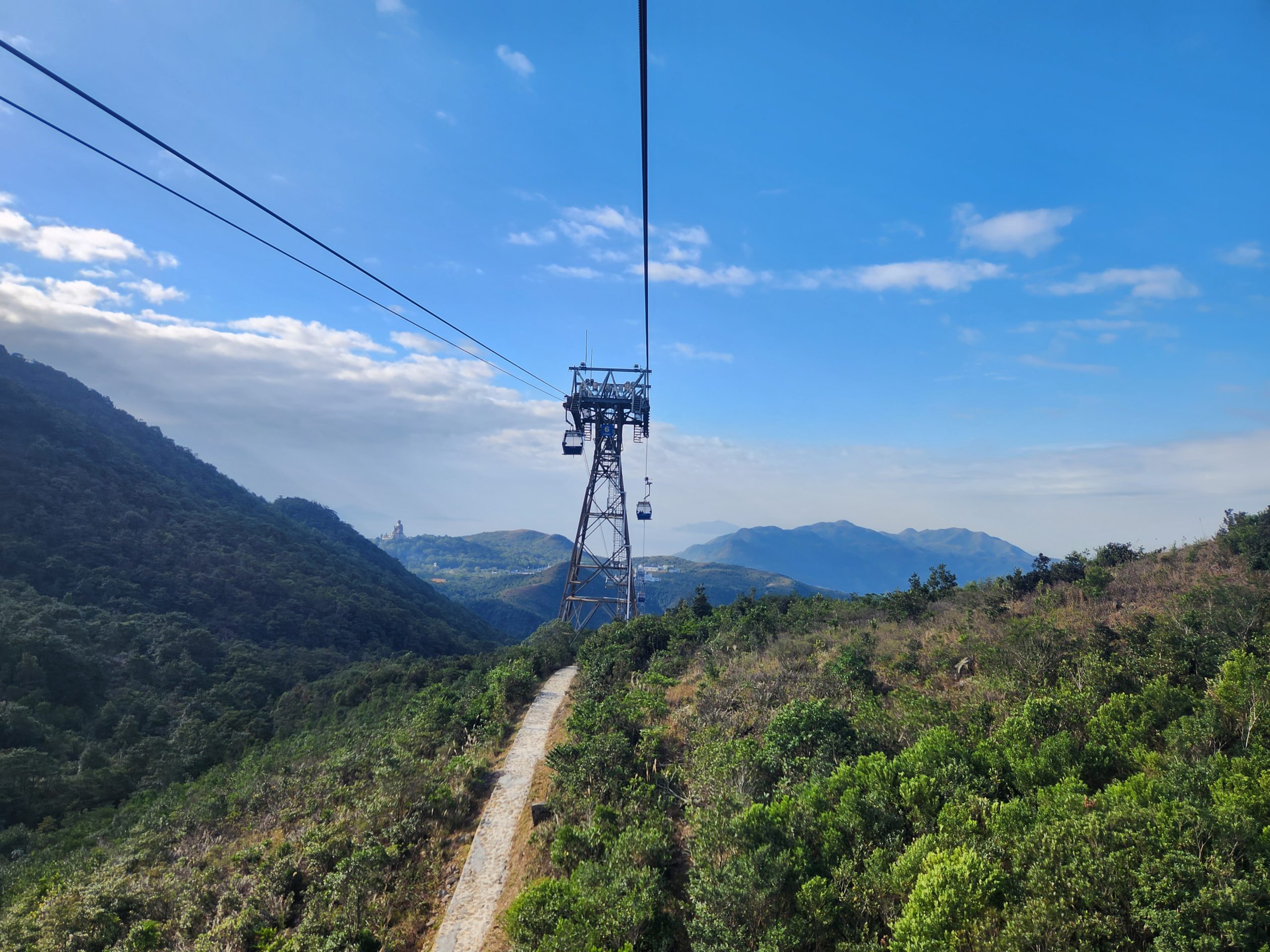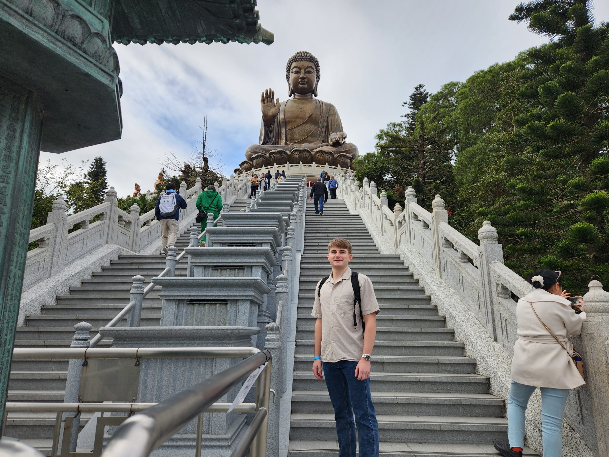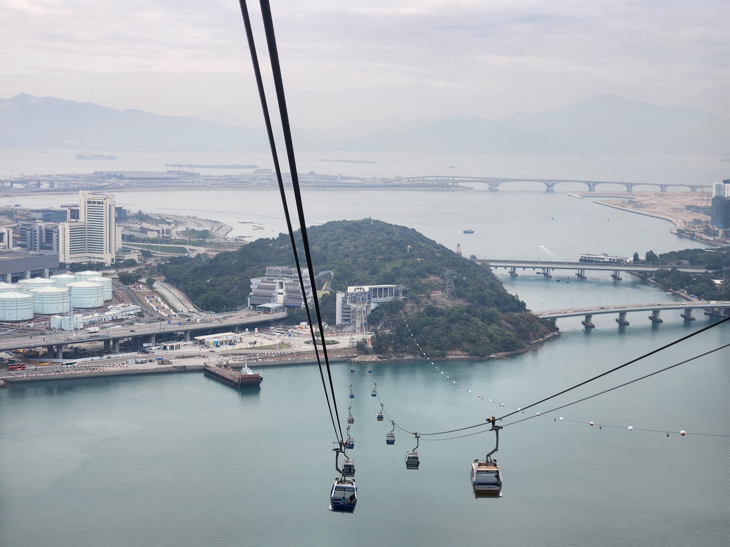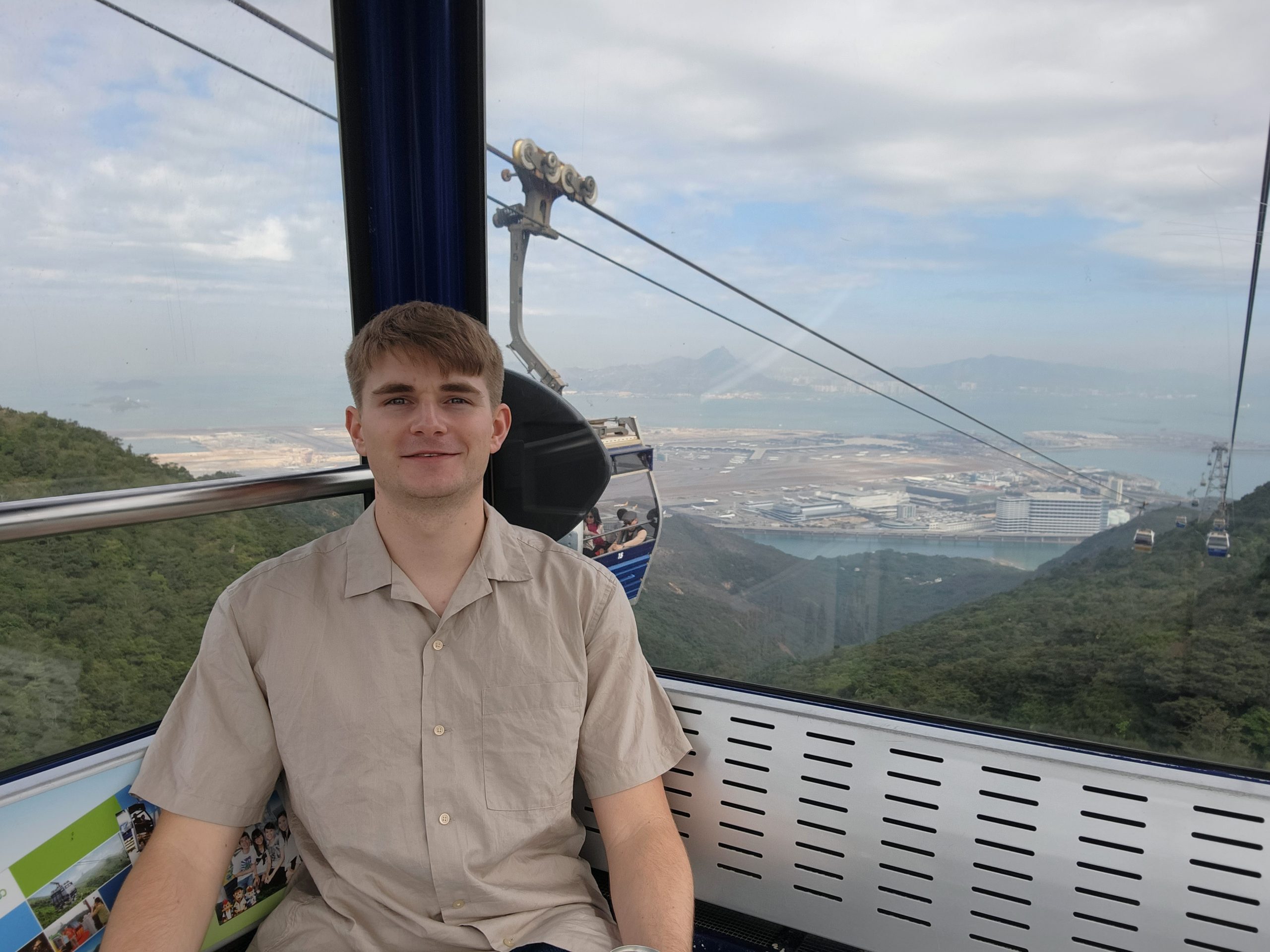 When the cable car opened, I headed up and purchased a ticket for a crystal car, meaning that it would have a glass floor. The views of the airport, surrounding mountains, bridges, and the Buddha statue were amazing. I thought it would be funny to try recreating some old photos of my dad from when we were all in Hong Kong as I feel that I look very similar now to how my dad looked back then. While I was doing this, I noticed that there was a new bridge behind me near the airport that had not been there last time. Eventually, it occurred to me that this was the new bridge that had been built connecting Hong Kong, Macao, and Zhuhai, which depends on the definition of a bridge (as it goes underwater in two places using manmade islands to let ships across), is the longest bridge across open water in the world.