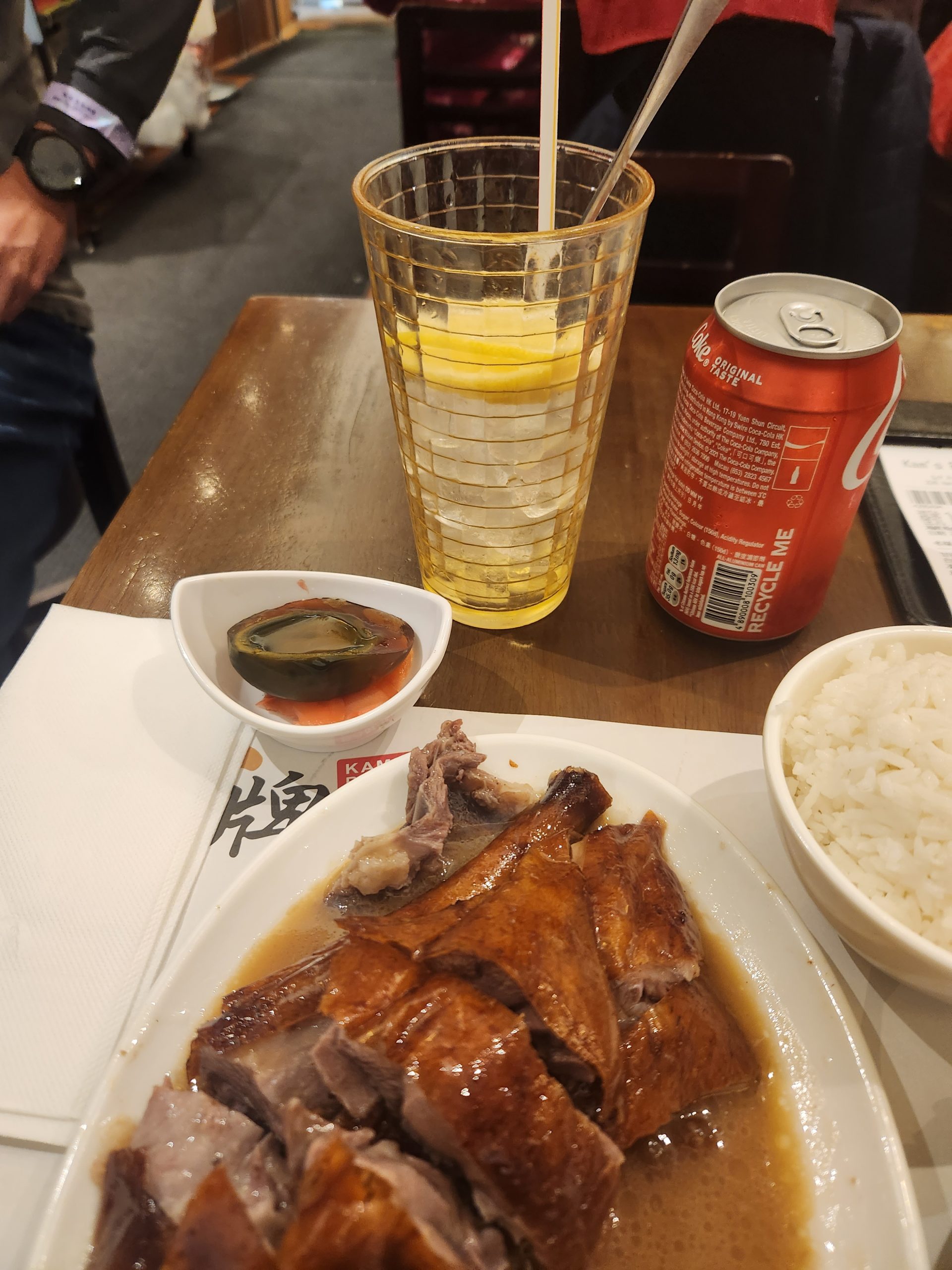 The restaurant I went to for dinner was called Kams Roast Goose, which I found online. When I arrived, there were so many people outside waiting to go in, so I thought it must have been good and got a number to wait in line. My number was 767 which is 七百六十七 (qi bai liu shi qi) in Mandarin, which was helpful for me to know as they were reading out the numbers in Mandarin for some reason (despite the main language in Hong Kong being Cantonese). It was a good opportunity for me to practice my Mandarin listening skills. The wait took very long, around 2 hours in total, as it turns out the restaurant was Michelin-starred. When I finally made it inside, I ordered a quarter roast goose and a century egg with rice and a coke with lemon. The main event, goose had a unique flavor. The cooking technique brought out this unique taste which at first, I was not so sure of, although it grew on me through the meal. It was a very rich taste and an experience that I enjoyed. The century egg was also quite delicious.